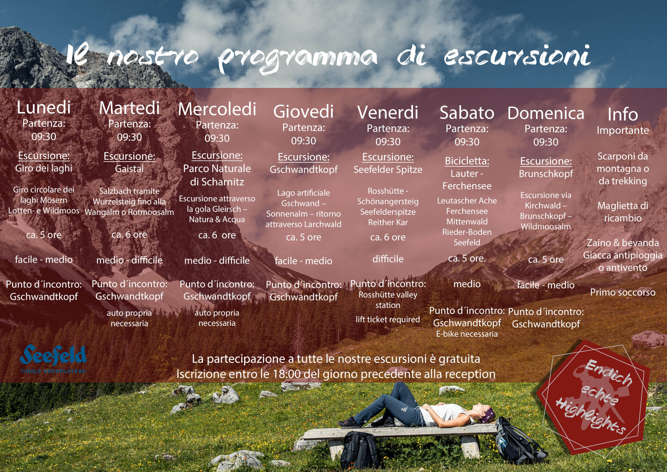 L’altopiano di Seefeld è la regione escursionistica del Tirolo più variegata, con oltre 650 km di sentieri escursionistici, montani e tematici ben segnalati. Situato a circa 1.200 m sul livello del mare, incastonato tra le cime mozzafiato del Tirolo, tra i monti del Wetterstein con la leggendaria Zugspitze e il parco naturale del Karwendel, l’altopiano offre uno scenario alpino particolarmente affascinante e un clima salubre d’alta quota ottimo per il sistema cardio-circolatorio.